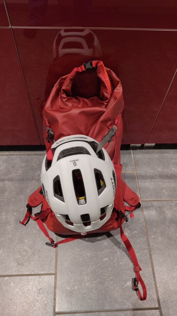 On that trip I didn’t take rain gear or an insulating jacket; the weather was so warm that a bikini, my little black Arc’teryx dress, and flipflops were enough extra luggage. To be a bit more resilient against bad weather, I got a larger waterproof 25l EXPED Typhoon backpack, red to match my bike, and am now doing my usual thing of cutting off extra-long, dangly straps and will try to repurpose them to make it easier to attach the backpack to the rack.