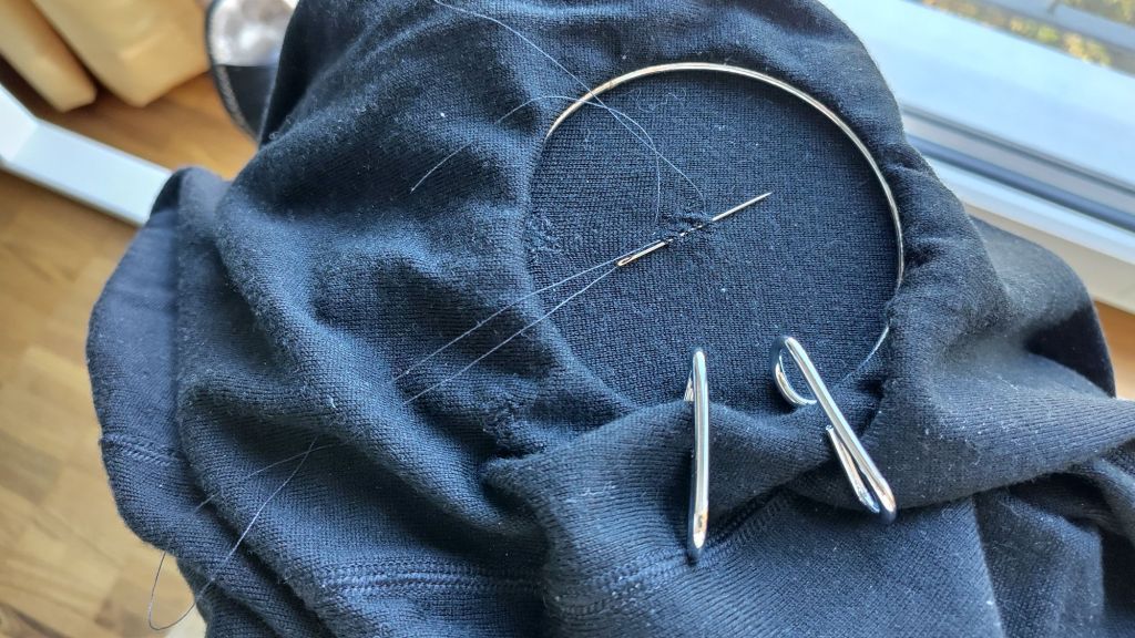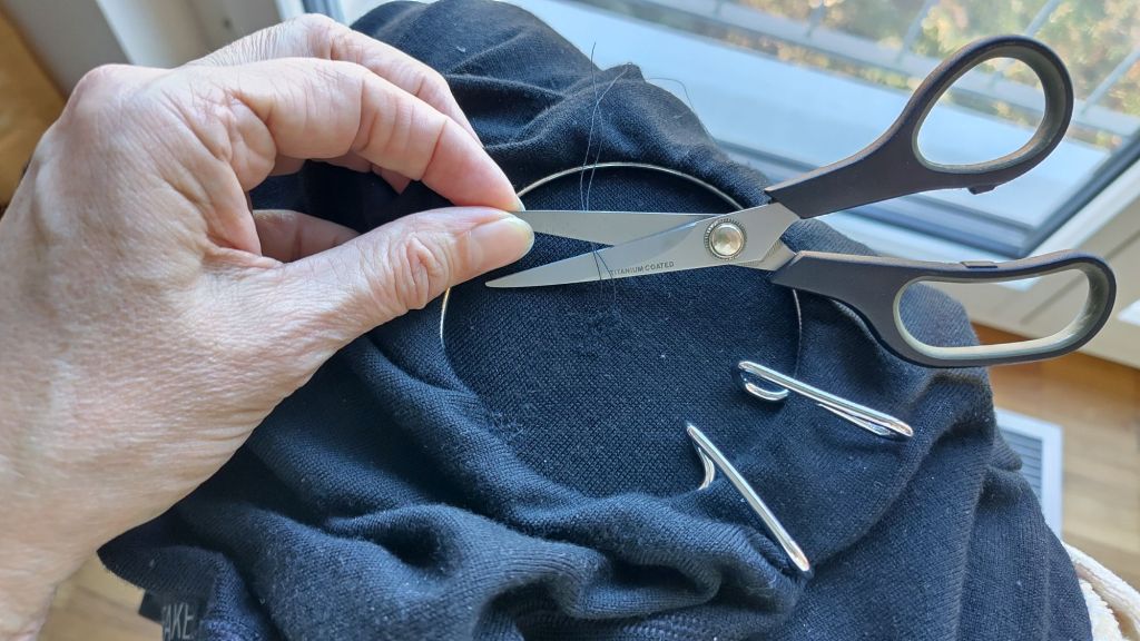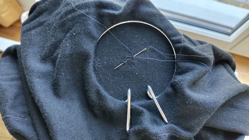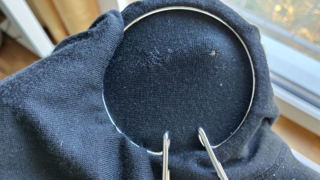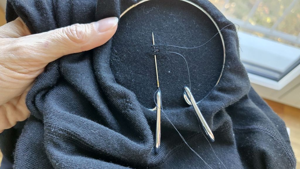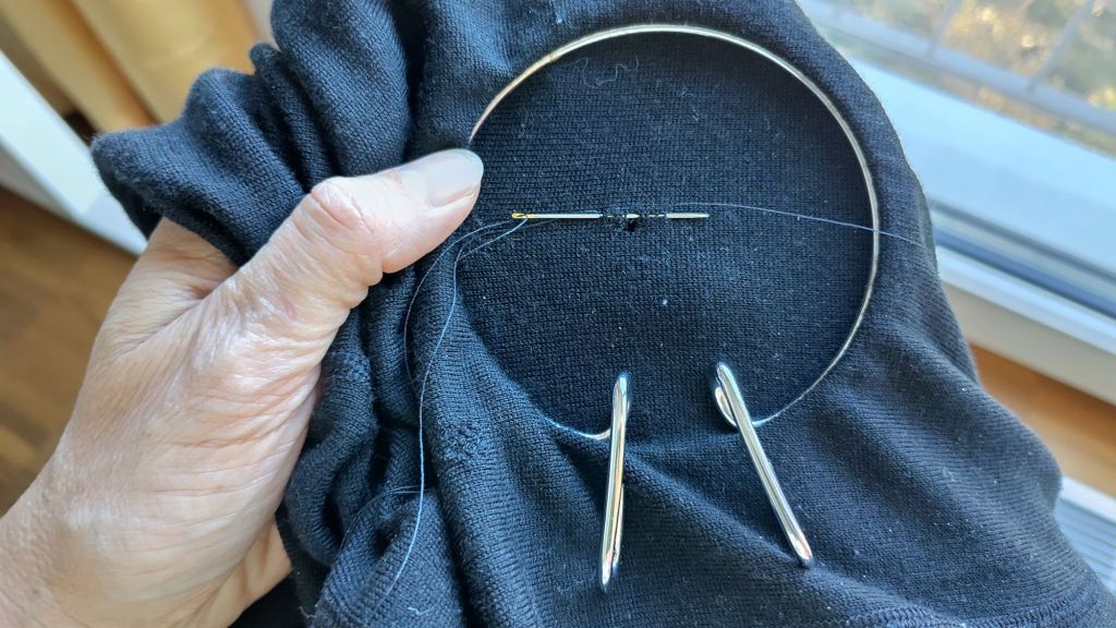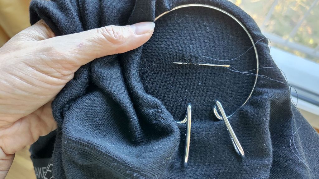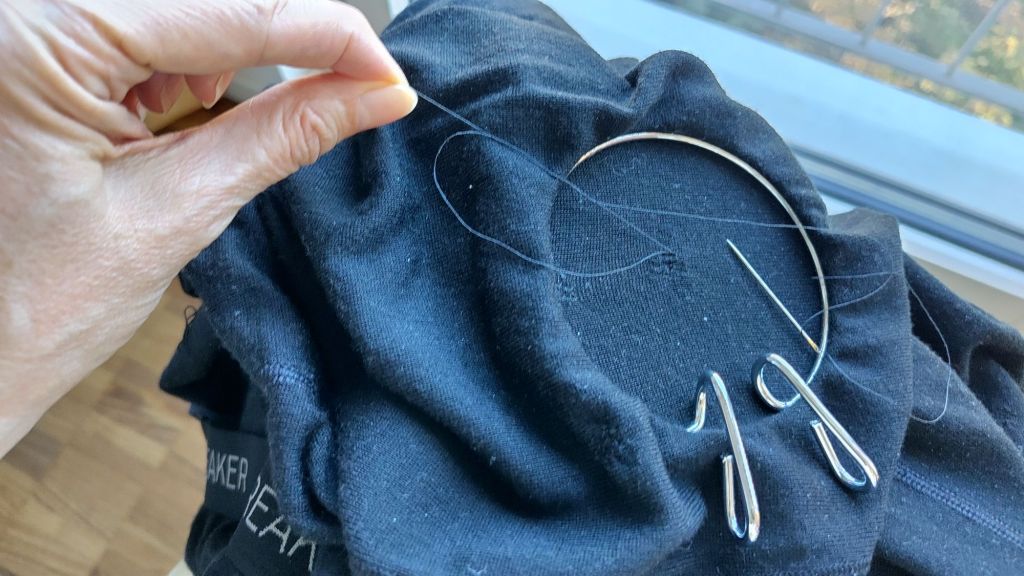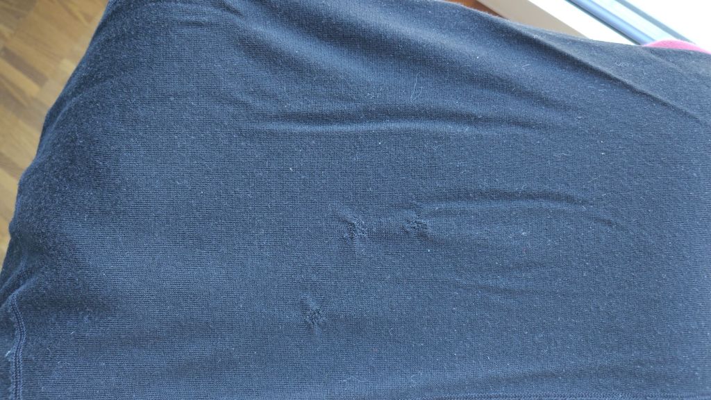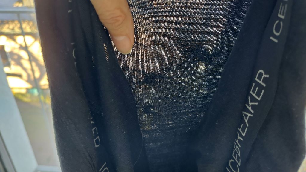 Before I embark on a new magnetic closure project (tent door? Magnetic nanobaggies? Jacket with magnetic strip instead of zipper?) I’m inspired/guilted to mend the moth holes in my “old” but barely worn 260 merino icebreaker long underwear.